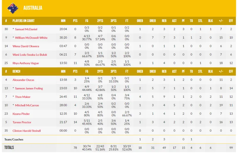 澳大利亚:弗洛林10分7板、梅克11分9板2帽、麦卡伦4分4板5助、怀特8份7板3助2断、普罗科特14分4板2助2断、瓦格11分4板、平德尔10分4板。