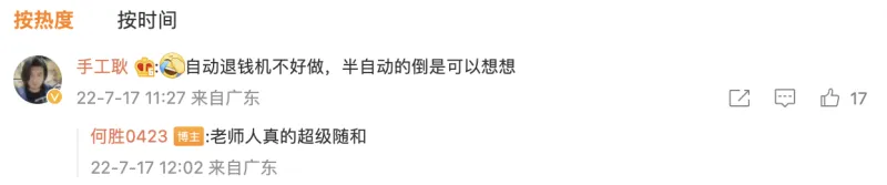 手工耿则回复称:“自动退钱机不好做,半自动的倒是可以想想。”4LB拜客生活常识网