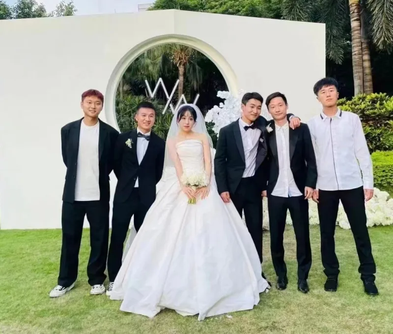 婚礼现场,陈科睿、姚均晟、唐诗、刘洋这些曾经的鲁能青训队友前来祝贺。
