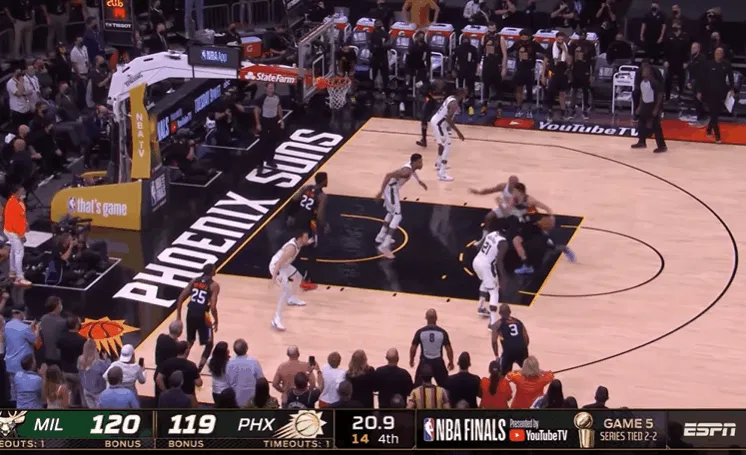 在比赛最后关头,霍勒迪完成致命抢断,随后字母哥完成终结比赛的扣篮。