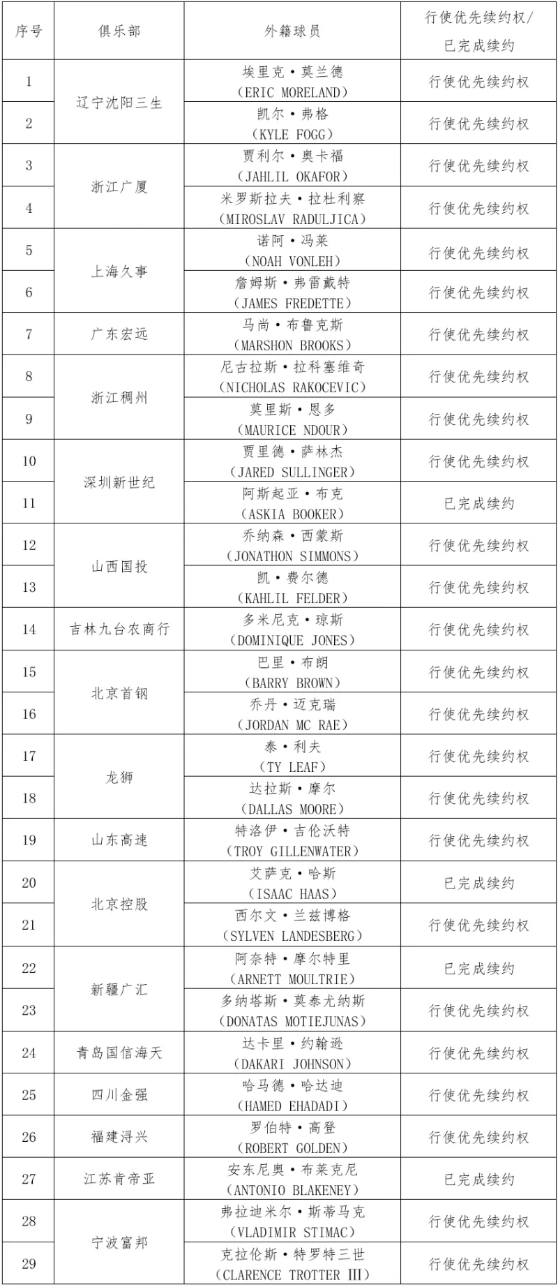 按照CBA的规定,每个赛季结束后,各队享有本队外援自由球员的优先续约权,保留此项权利,可以用来和对应的外援签约,也可以用作交易筹码,未保留此项权利,则他们的外援自由球员成为了完全自由球员,可以自由和任何CBA球队签约。