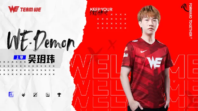 在与选手吴玥玮(ID:Demon)充分沟通后,我们正式宣布,现将原WE.A上单选手Demon上调至西安曲江WE电子竞技俱乐部英雄联盟分部,担任上单位置,与我们共同征战接下来的比赛。