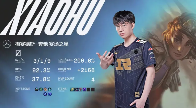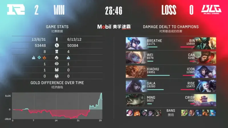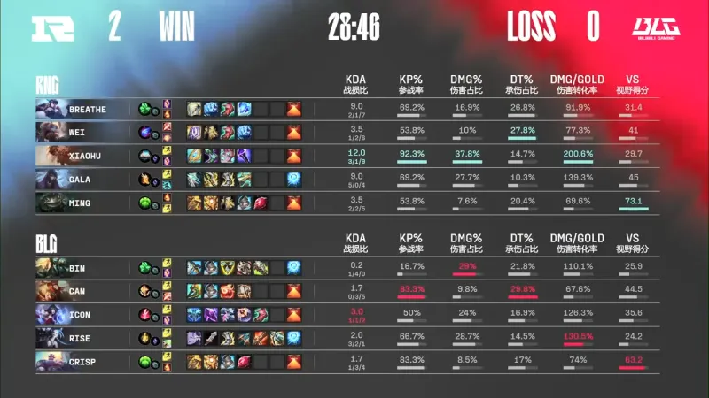 比赛第27分钟,breathe瑟庄妮绕后配合队友瞬秒Icon阿狸,随后Xiaohu岩雀开大绕后配合队友秒掉两人,RNG随后直接一波结束比赛。