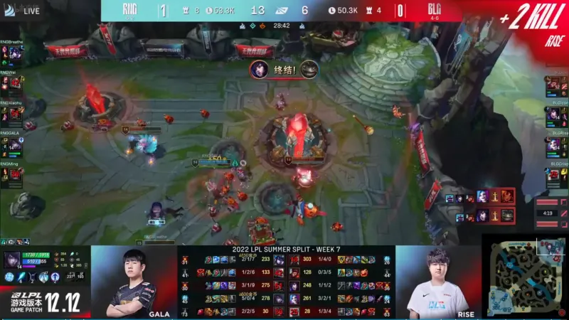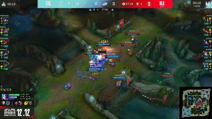 比赛第24分钟,Xiaohu岩雀抬回Rise金克斯。RNG抓到机会击杀BLG下路随后开大龙并拿下。
