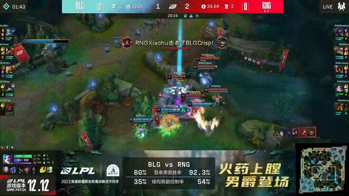比赛第22分钟,双方上单在野区的摩擦迅速升级为两方团战。RNG打出1换3拿下电龙魂。