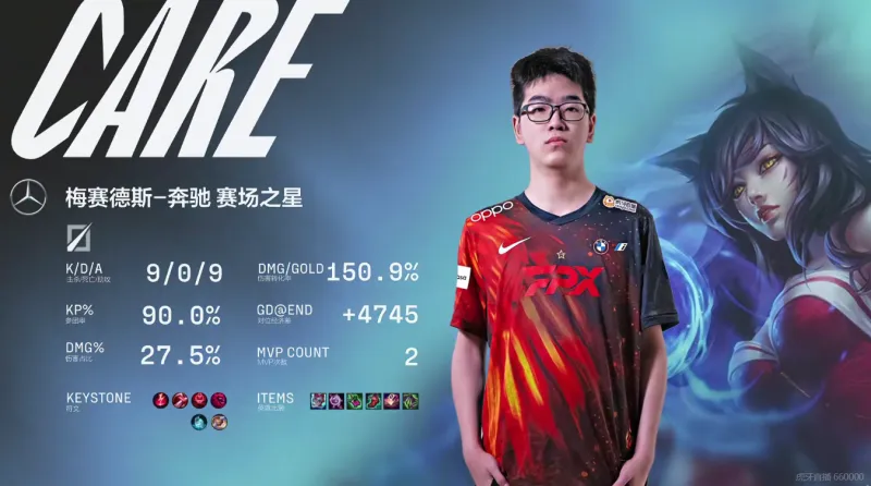 3分钟,阿狸E闪留住乌鸦,盲僧跟进补齐伤害将其击杀,FPX拿下一血。