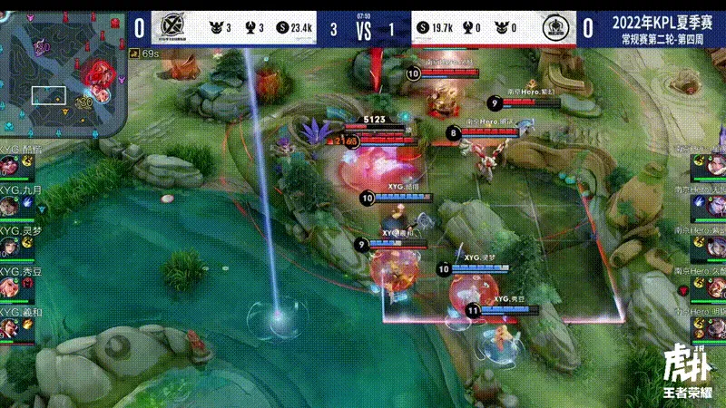 7分52秒,Hero蓝区团战打响,紫幻弈星大招框住多人,久酷黄忠架炮持续输出,随后黄忠被九月宫本切死,最终XYG打出了1换4