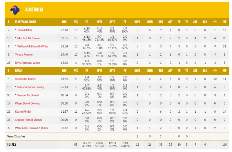 澳大利亚:弗洛林7分6板2断、梅克18分9板、麦卡伦13分4断2帽、威廉-怀特15分3板7助、普罗科特13分2板、德尔11分6板。
