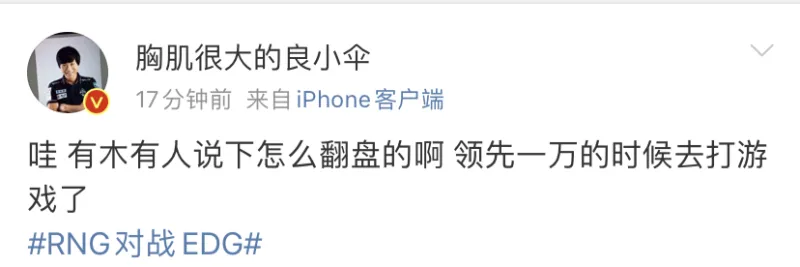 解说小伞:“哇 有木有人说下怎么翻盘的啊 领先一万的时候去打游戏了。”