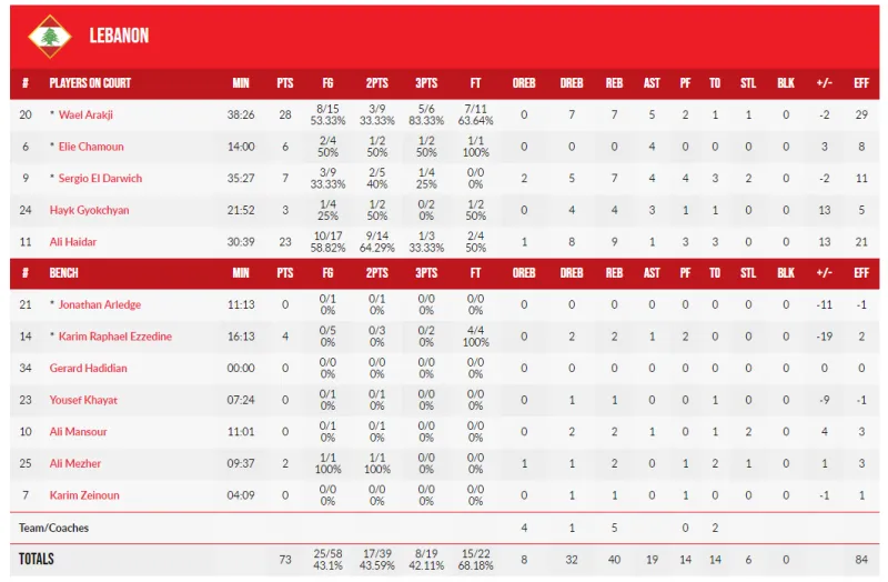 黎巴嫩:阿拉基28分7篮板5助攻、查蒙6分4助攻、海达尔23分9篮板、达维奇7分7篮板4助攻。