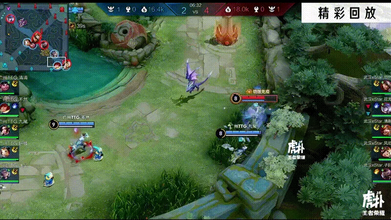 6分33秒,九尾不知火舞下路对风劫虞姬动手将其打残,随后不然裴擒虎配合冰尘鲁班大师越塔击杀虞姬