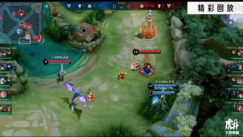 7分07秒,下路草花海子阳蹲伏许久,不然橘右京探草遭受集火阵亡,随后娜可露露反复迂回再次击杀九尾弈星,拿下双杀