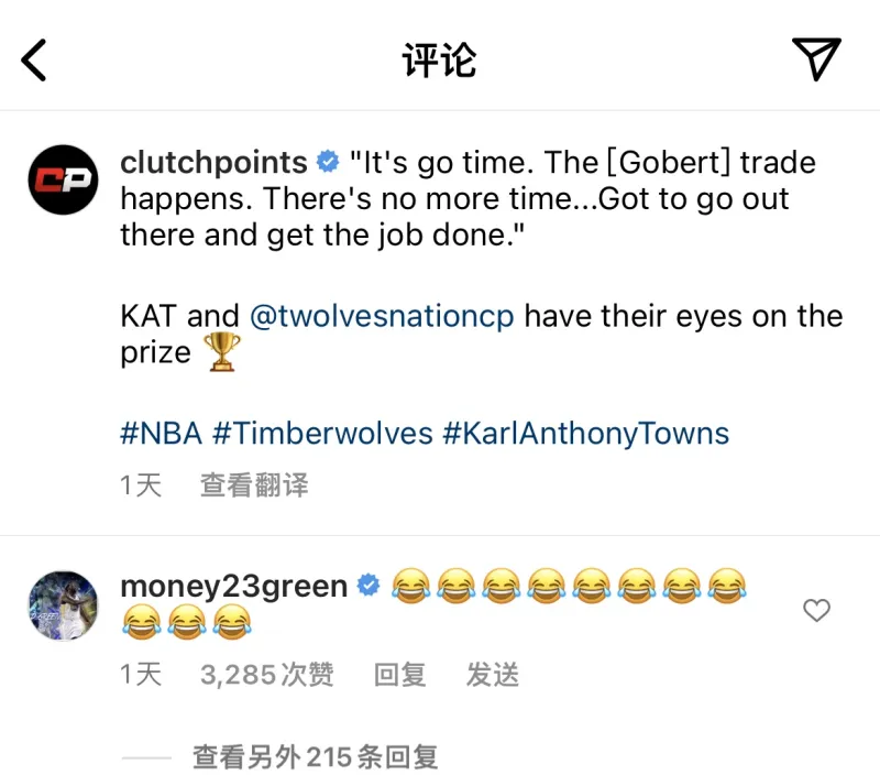 07月25日讯 近日,媒体ClutchPoints在其Instagram上晒出森林狼中锋卡尔-安东尼-唐斯的争冠言论。