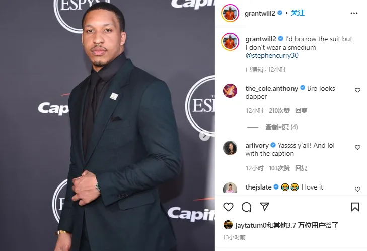 今日格威也是在ins上晒出了自己身穿西服的照片,并友好地“回击”库里:“我倒是想借你的衣服穿穿,但我穿不惯小一号的衣服@库里”
