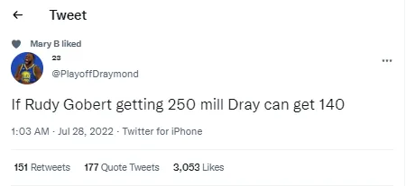 今日追梦格林的粉丝自媒体@23发布推特:戈贝尔能拿2.5亿合同的话,追梦拿1.4亿我们觉得也完全可以。