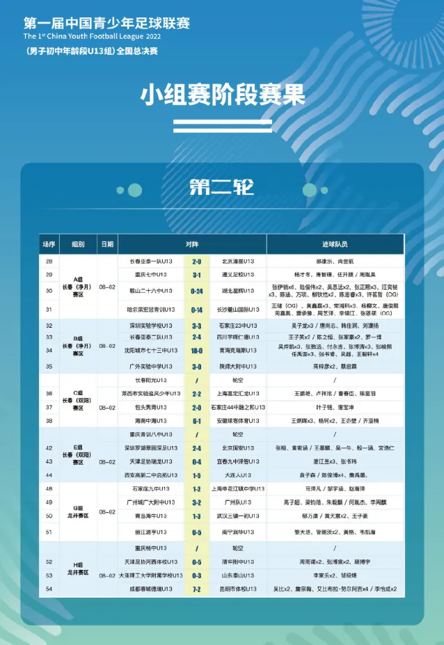 08月03日讯 根据今日中国足协公布的中国青少年足球联赛U13组第二轮的比赛结果,湖北星辉U13以24-0大胜鞍山二十六中U13。