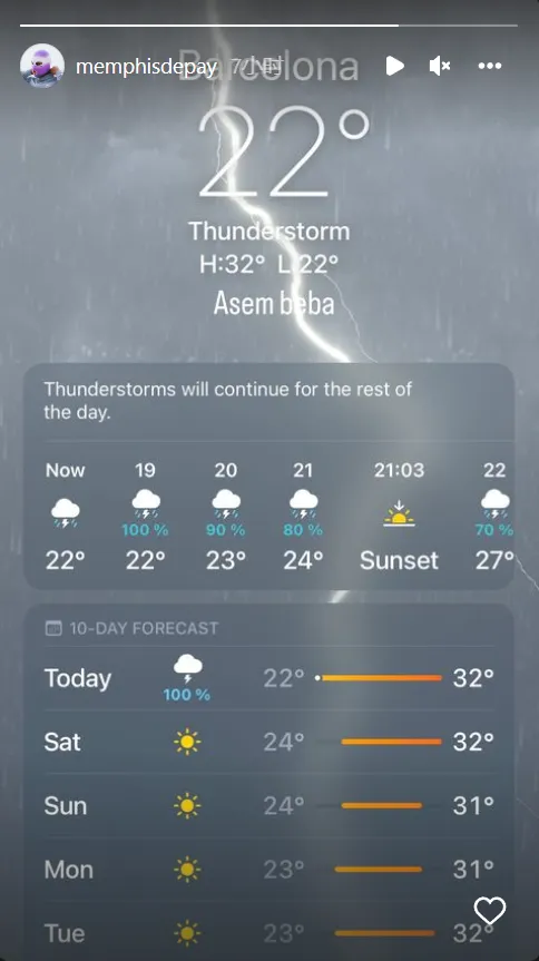 08月06日讯 巴萨前锋德佩7小时前更新了自己的社交媒体,晒出巴塞罗那地区的雷暴天气预报截图,并配文:Asem beba。