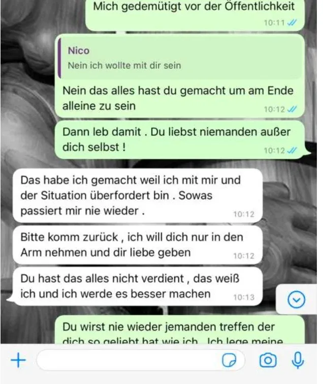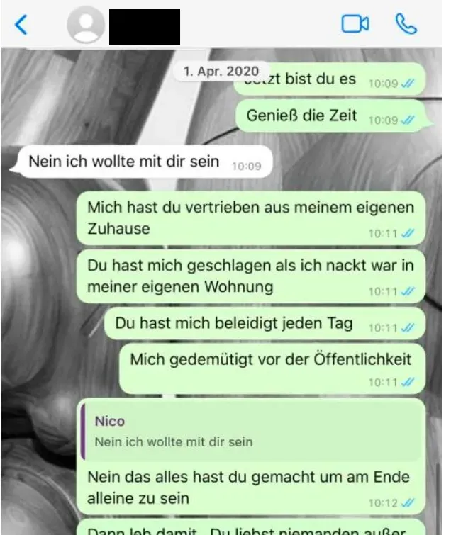 据报道2020年3月31日,舒尔茨在公寓里再次袭击了J。一天后,J发信息给舒尔茨:“你把我赶出了自己的家”,“当我在自己的公寓里赤身裸体时,你就开始打我”,“你每天都在侮辱我”,“在公众面前羞辱我”。