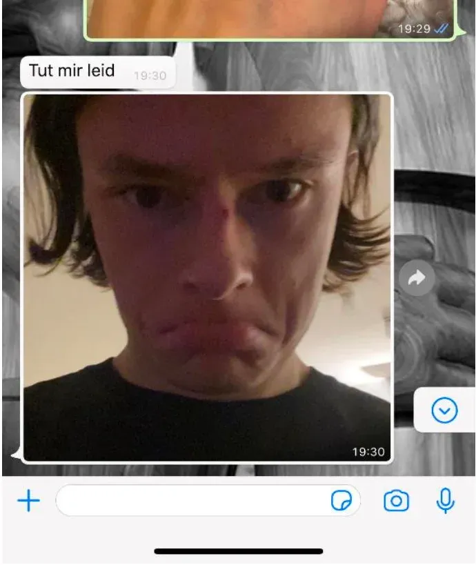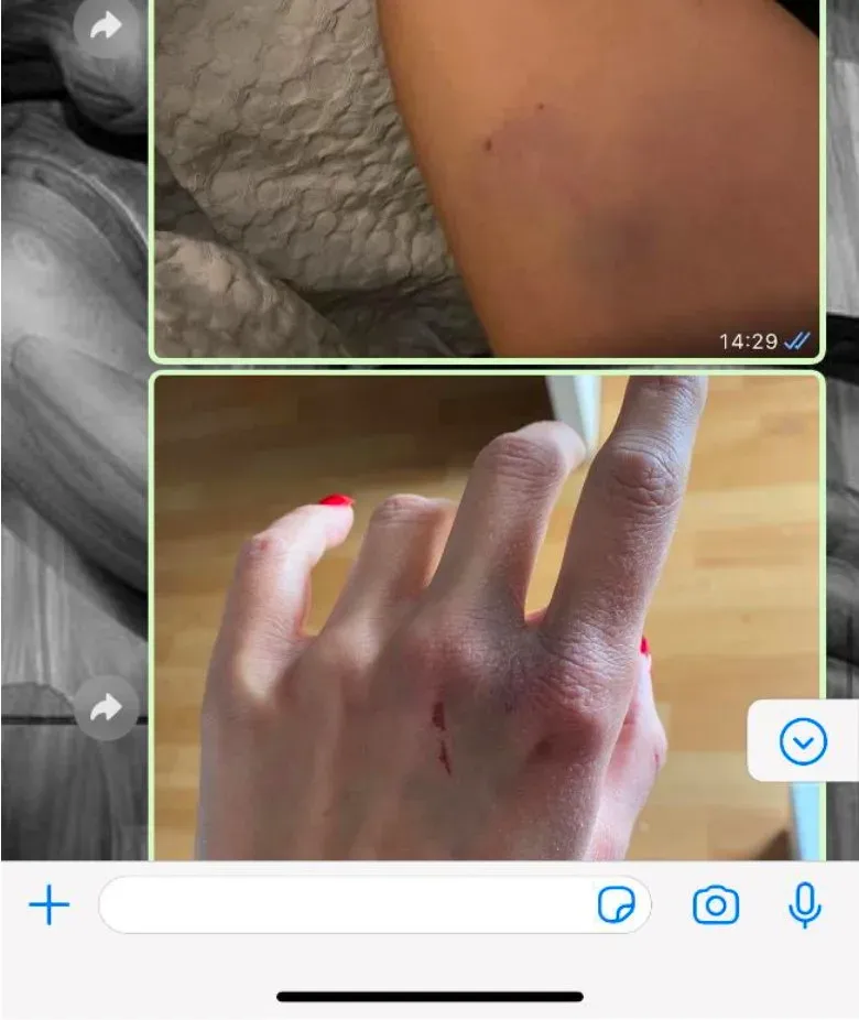 2020年3月,J给舒尔茨发送了照片。可以看到的是:手臂上有瘀伤,手也青了。答案是舒尔茨嘴角朝下的一张自拍。他可能是想表达他的遗憾。
