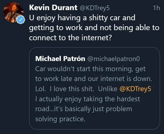 有一位网友早起发了一条推特,吐槽今晨自己的倒霉经历:“我的车子今天早上启动不了,上班迟到了,我的网也断了。哈哈哈,我爱这些破事。跟杜兰特不一样,我是真的很喜欢走最艰难的路...这样能锻炼我解决问题的能力。”他还在推特中@了杜兰特的推特账号。