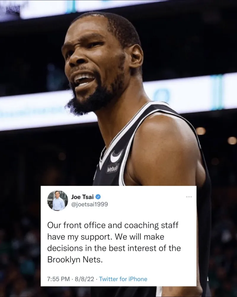 就在刚刚,篮网老板蔡崇信发布推特:“我们的管理层和教练组有我的支持,我们会基于篮网整支球队的最大化利益来做一切决定。”