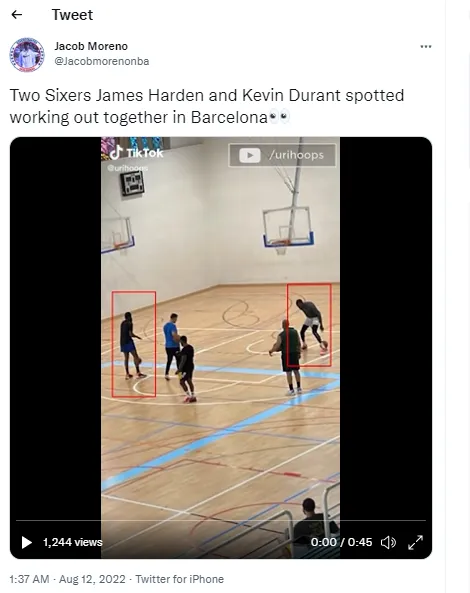 08月12日讯 今日76人媒体人Jacob Moreno在推特上晒出一段视频,为哈登与杜兰特二人一起在欧洲巴塞罗那训练的视频。