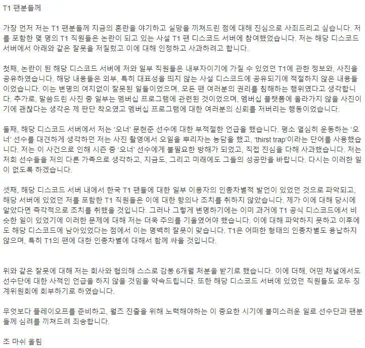 第三, 在该Discord服务器里的部分用户就T1韩国粉丝发表了种族歧视性的言论,而当时在此服务器里的我和其他T1职员们都未对此进行抗议或采取措施。若在当时了解到该事件,我会立刻采取措施。然而对此我无法辩解是因为之前已有类似事件发生,而我应该更加注意才对。我认为当时并未采取任何举措,并未退出服务器的这个问题无疑是错误的。T1不会容忍任何形式的种族歧视,特别是对T1粉丝的种族歧视,将会与粉丝们一起斗争。