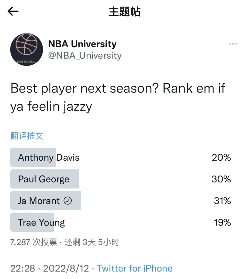 08月16日讯 近日,数据博主NBA University发起了一项面向网友的调查。