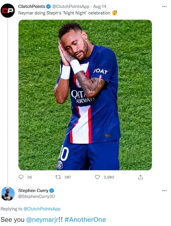 昨日美媒ClutchPoints晒出了内马尔晚安庆祝动作的图片,库里本人转发了该条推特并@内马尔:“瞧见你啦@内马尔,#又一个。”