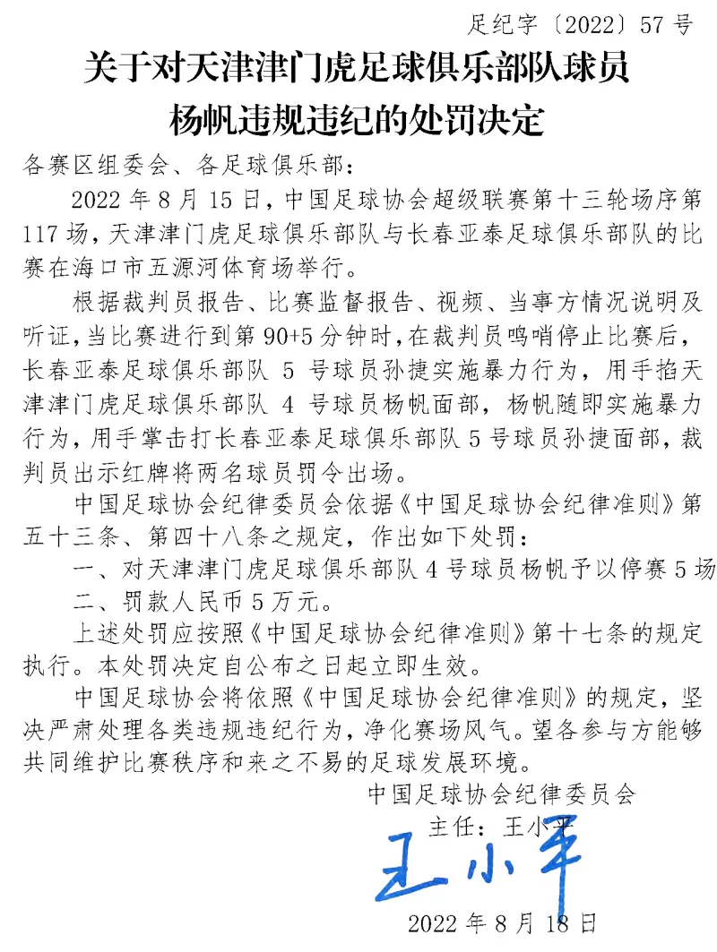 08月18日讯 足协官方宣布,对亚泰队长孙捷、津门虎杨帆处以禁赛5场、罚款5万的处罚。