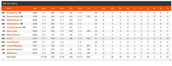 08月21日讯 WNBA季后赛首轮G2,纽约自由人62-100不敌芝加哥天空,大比分被扳平为1-1。