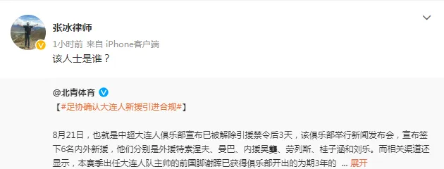 该媒体表示,就在俱乐部官宣活动结束后。一位为多名中超球员代理欠薪纠纷仲裁案件,名为张冰的律师通过个人社交平台对大连人俱乐部引援一事提出了异议。他在微博中写道:“惊悉大连人足球俱乐部免签高薪注册了2外4内实力球员,有钱有才,就是一点不好,强硬欠薪、拒不支付。如果真的已完成注册,那说明足协今天有人加班了,纪律委应该不在加班。明天工作日,立即联系,申请纪律委紧急出台处罚措施,禁止上述新注册球员上场比赛,否则这不就是公然违法吗?我坚信足协纪律委会执法必严、违法必究。”