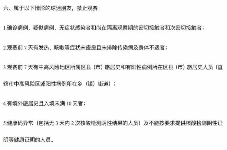 值得注意的是,4家开放看台的俱乐部中,大连人和北京国安均在票务公告中明确指出确诊病例、疑似病例、无症状感染者是被禁止购票观赛的。8月初大连人公布的票务方案中,大连市域内有8种类型的人群是不被允许购票入场的,具体包:半年内被诊断为确诊病例、疑似病例或无症状感染病例的;赛前10日内与确诊病例、疑似病例或无症状感染者有密切接触的;居住地社区赛前10日内有疫情发生的;有发热(37.3°C以上)等疑似症状且未痊愈的;赛前10日内本人及家庭成员(共同居住人员)有境外地区旅居史或人员接触史的等。北京国安的票务方案同样也有类似的规定,以下5类球迷是被禁止观赛的,具体包括确诊病例、疑似病例、无症状感染者和尚在隔离观察期的密切接触者和次密切接触者;观赛前7天有发热、咳嗽等症状未痊愈且未排除传染病及身体不适者;观赛前7天有中高风险地区所属区县(市)旅居史和阳性病例所长在区县(市)旅居史人员(直辖市中高风险区或阳性病例所在乡(镇)街道);健康码异常及不能按要求提供核酸检测证明等健康证明的人员。