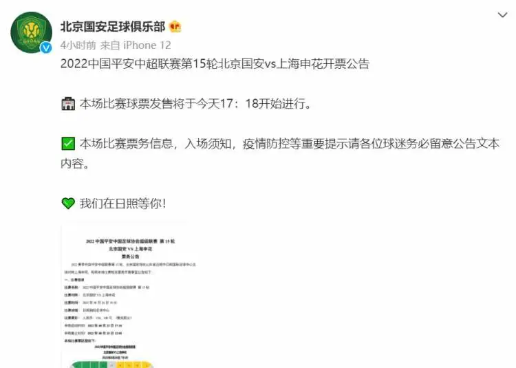 今天下午,北京国安俱乐部发布了中超联赛第15轮主场对阵申花的票务公告。至此,已有大连人、河南嵩山龙门、北京国安和浙江等4家俱乐部开放看台,允许球迷入场观战。