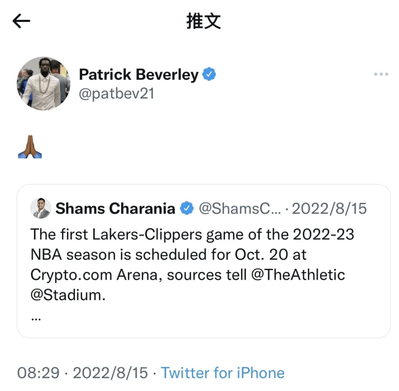 有湖人球迷此时转发了在8月15日部分新赛季出炉时,贝弗利转发湖人将在新赛季第二场比赛中主场迎战快船的赛程报道推文,这也是洛杉矶两支球队的新赛季首次交锋。
