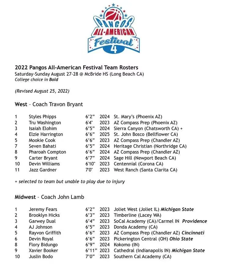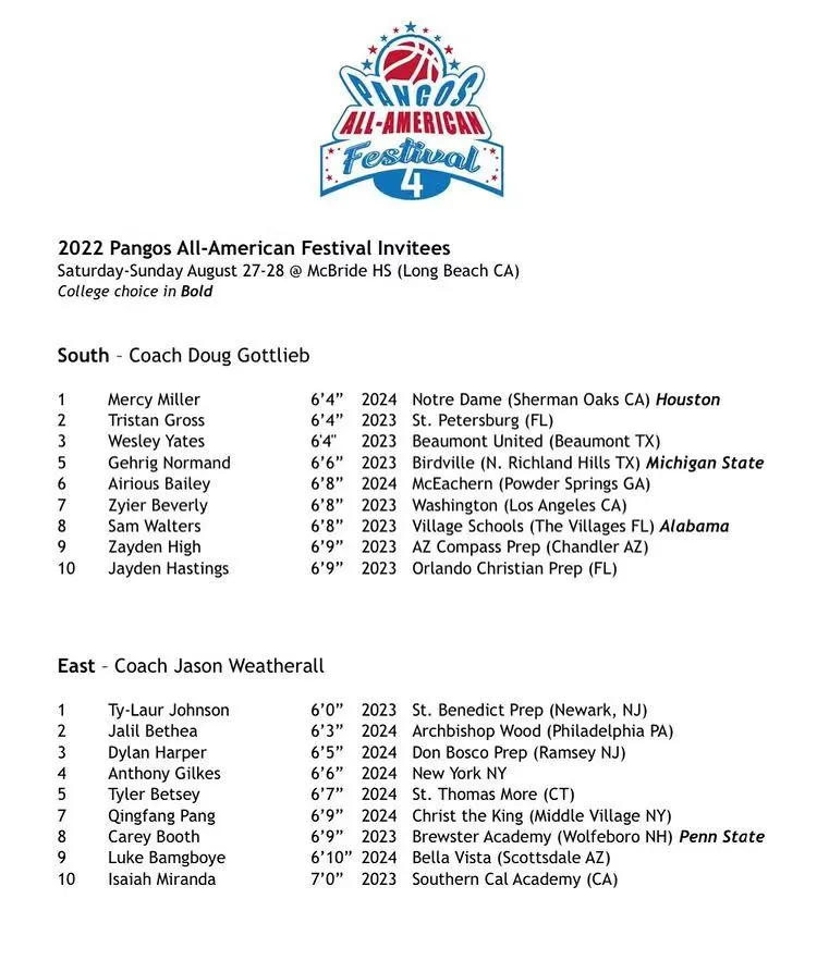 Pangos全美高中生全明星赛将于8月27日-28日举行,庞清方所在的东部队将在美国西部时间8月27日下午18:00对阵中西部队。该项赛事曾培养96位NBA首轮秀,其中包括40名乐透秀。现役NBA球员詹姆斯-哈登、约翰-沃尔、哈里斯-巴恩斯和斯坦利-约翰逊曾获Pangos全美高中生训练营MOP,此外,安东尼-戴维斯、阿隆-戈登、拉塞尔-威斯布鲁克和德玛尔-德罗赞等球员也都曾参加过该项比赛。值得一提的是,本届NBA选秀前三顺位球员均参加过该项赛事。