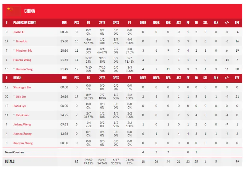 杨瀚森17分11篮板3助攻3盖帽,刘礼嘉19分5篮板,王浩然11分7篮板,马明坤11分9篮板7助攻。
