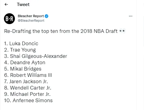 08月27日讯 今日美国媒体Bleacher Report重排了2018届的选秀,东契奇当选状元,特雷-杨榜眼,亚历山大探花。