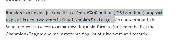 C罗只得到了一个确定的报价:3亿欧元(2.548亿英镑),让他在沙特阿拉伯职业联赛效力两年。从目前的情况来看,沙特的钱对一个寻求平台来进一步优化欧冠和他的历史奖杯和记录的人来说是无用的。