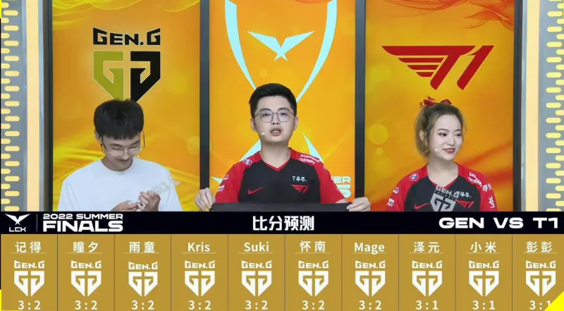 其中四人认为GEN将3-2取胜,七人认为GEN将3-1取胜,两人认为GEN将横扫T1。