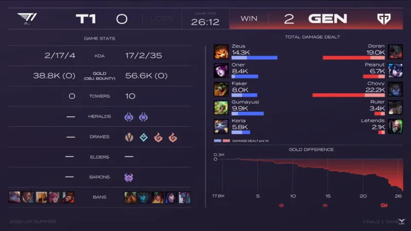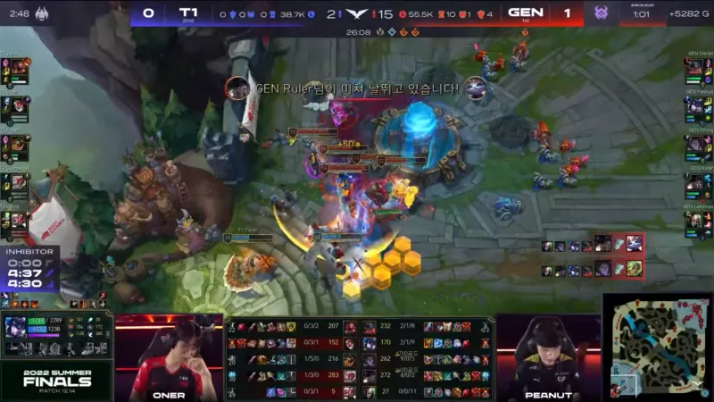 比赛第24分钟,T1强开Doran剑魔,GEN反手接团打出0换5团灭T1拿下大龙。随后GEN依靠大龙buff推进一波结束比赛