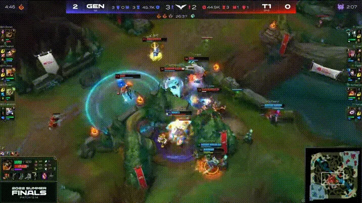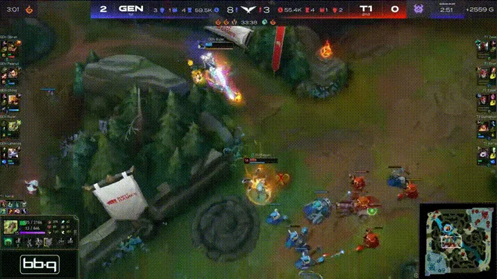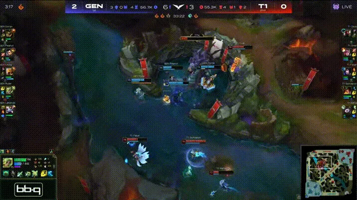 比赛第32分钟,Zeus试图TP绕后然而T1其余人撤退,Zeus被集火后GEN开大龙。随后GEN回身接团将T1团灭后一波结束比赛。