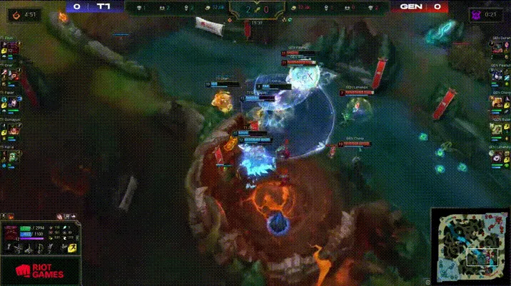 比赛第19分钟,双方在小龙区域爆发团战。Ruler泽丽大中四人随后爆炸输出,GEN打出0换4一举建立优势。