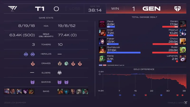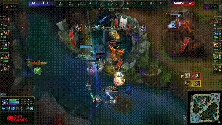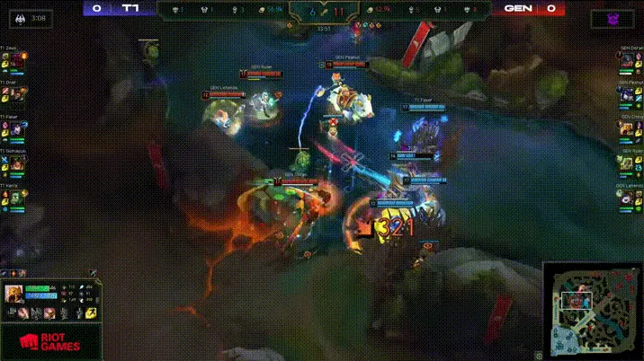 比赛第33分钟,GEN抓掉落单的Oner随后开大龙,T1被迫接团白打成0换4,Ruler再拿双杀,随后GEN拿下双龙汇。