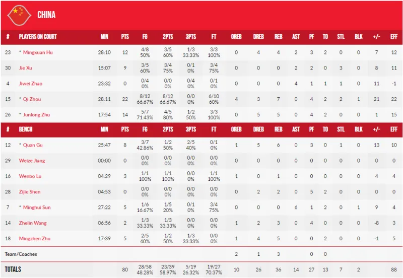 周琦22分7篮板,朱俊龙14分4篮板,胡明轩12分4篮板2助攻,徐杰9分,顾全8分6篮板,孙铭徽5分6助攻。