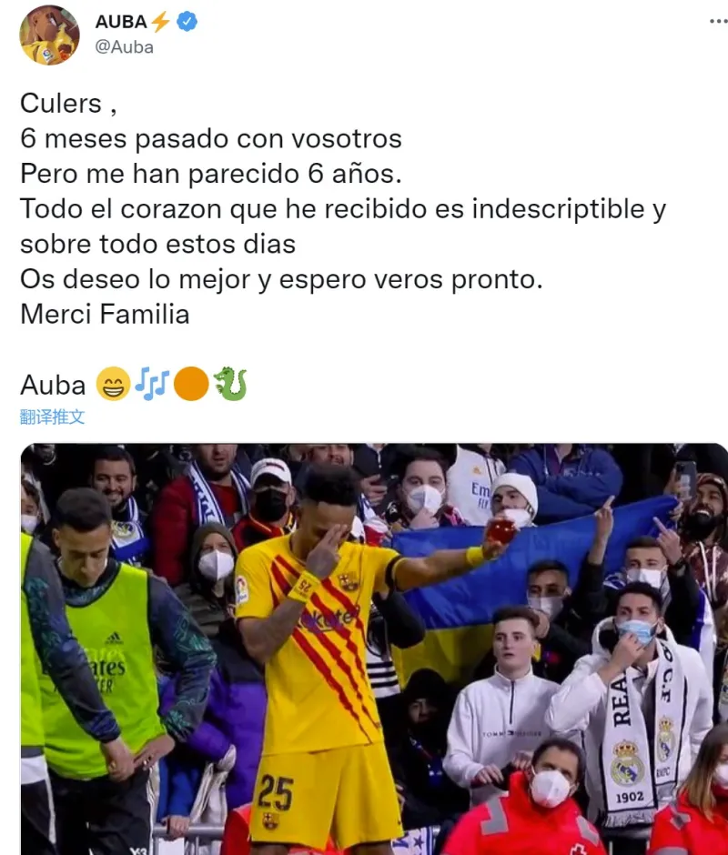 “巴萨球迷们,过去的6个月和你们在一起,就像是6年一样,这段时间里我收到的来自大家的真心是无法形容的,尤其是在最近的这几天。祝愿大家一切顺利,希望能够早日和大家再见,感谢你们,家人们!”