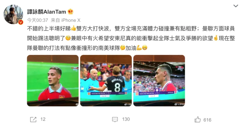 主队获胜,谭咏麟称曼联踢得像冲撞型南美球队,还称曼联球员踢得更聪明了,而且眼神中开始有火了,并表示希望安东尼能提振全队士气,激发球队获胜欲望。