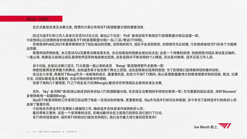 经过与选手们和工作人员多次交流与讨论之后, 做出以下决定:Polt崔成训将不再担任T1英雄联盟分部总监督一职, 今后他将以总经理的身份继续服务于T1的英雄联盟分β(一队/二队/青训/T1学院)。