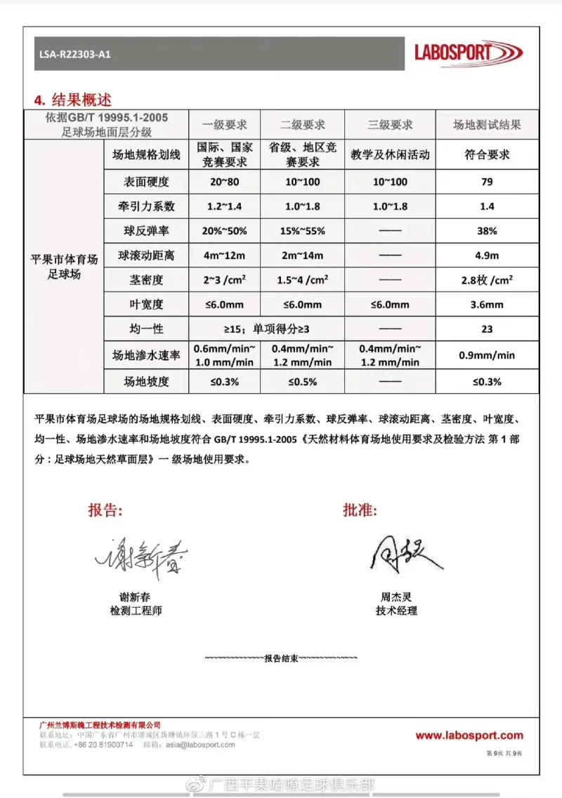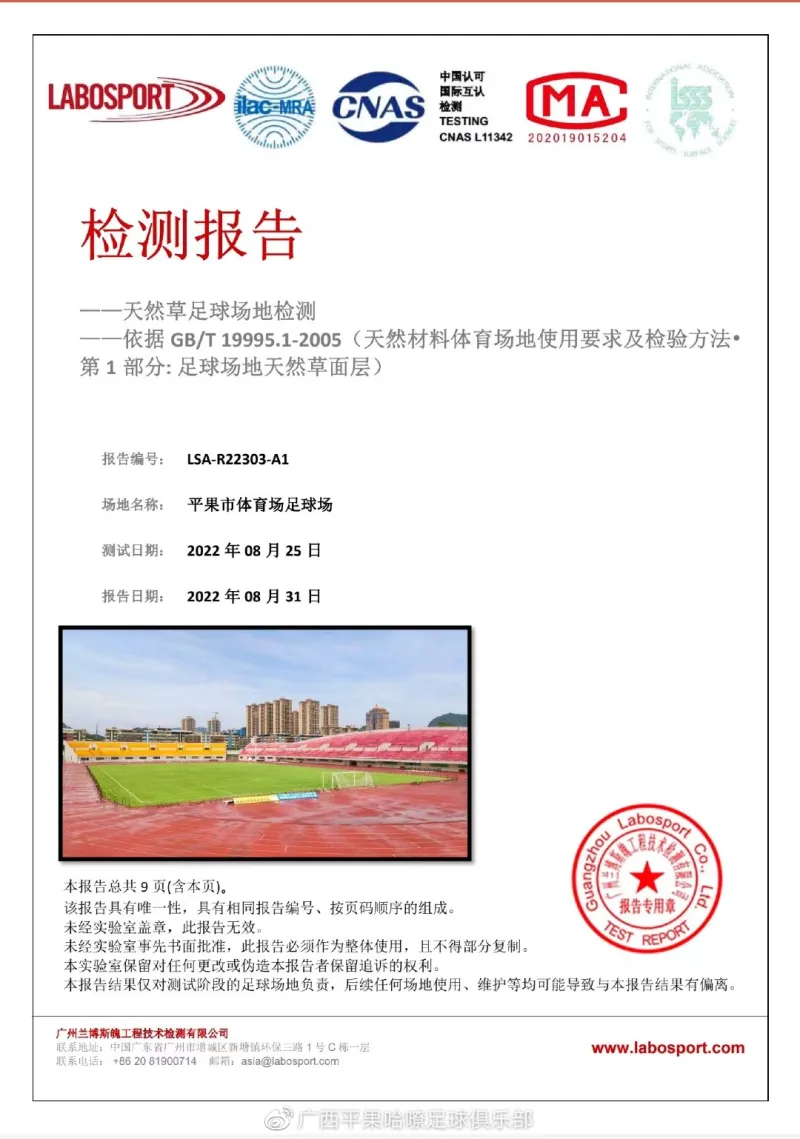 为了承接主场比赛,主场赛区2月份就开启动工,开始做好硬件准备,改造了平果市体育场的休息室和功能房,翻新过的草坪十分漂亮。目前已经全部完工,8月31日场地和草坪通过了国际足联认可的官方检测单位验证,拿到了检测合格的报告,草坪条件达到了全国顶级的场地行列,球场平整度和松软度十分舒适,有助于提升球员们比赛时的运动表现,漂亮的平果主场将向全国球迷展示广西足球的风采,球队也将在足协杯赛上展现出顽强斗志和拼搏精神,回报广大球迷的厚爱。