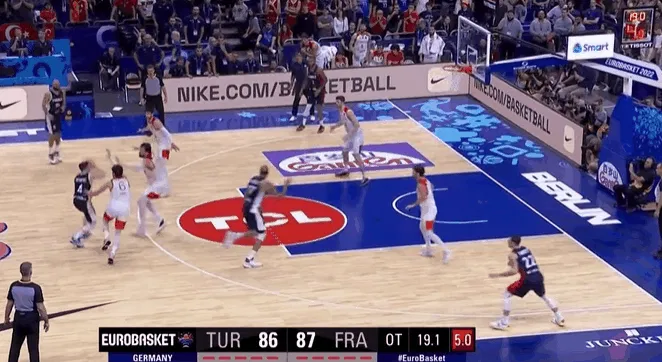 最后一攻,土耳其进攻失误,被法国直接抢断,随后时间走完,法国1分险胜土耳其。